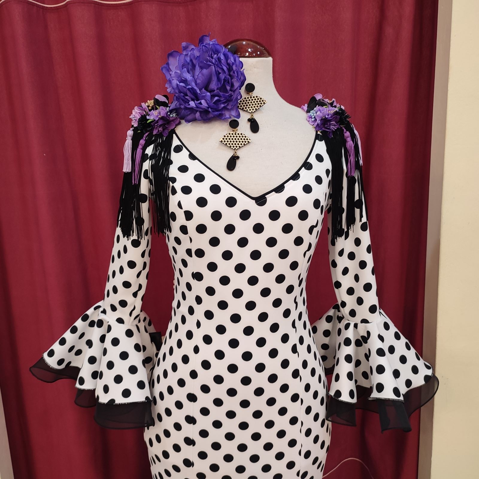Traje de flamenca para señora. Vestido confeccionado en tela de licra en color blanco con lunar medio negro.