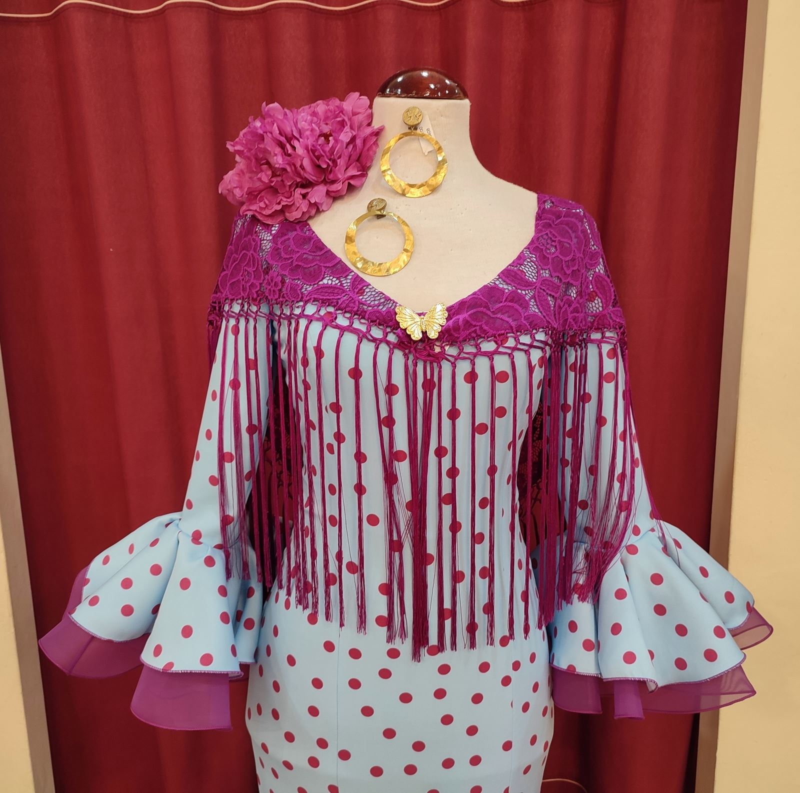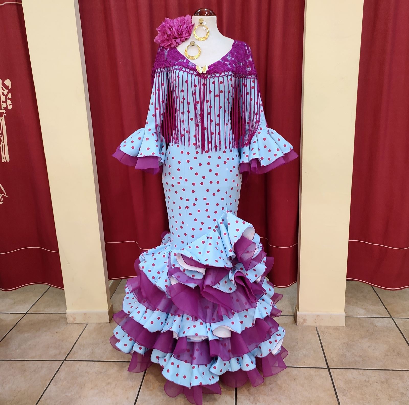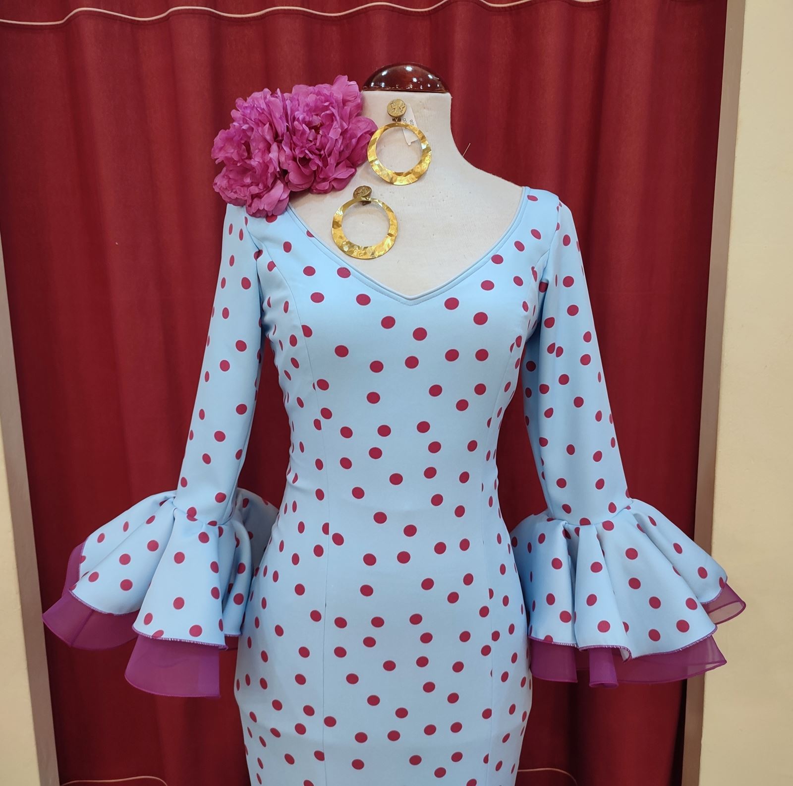 Vestido de flamenca confeccionado en tela de licra celeste con lunar buganvilla.