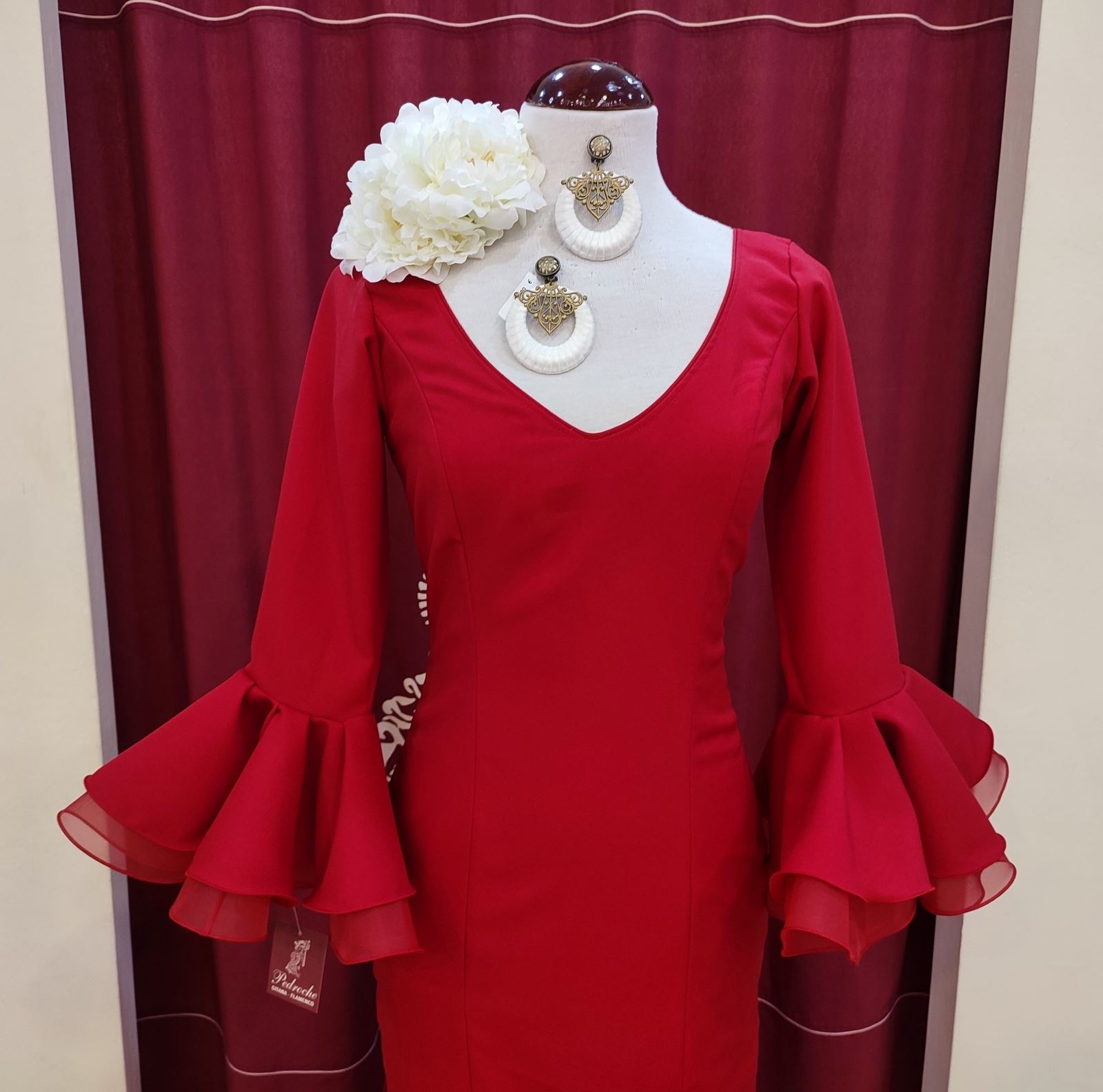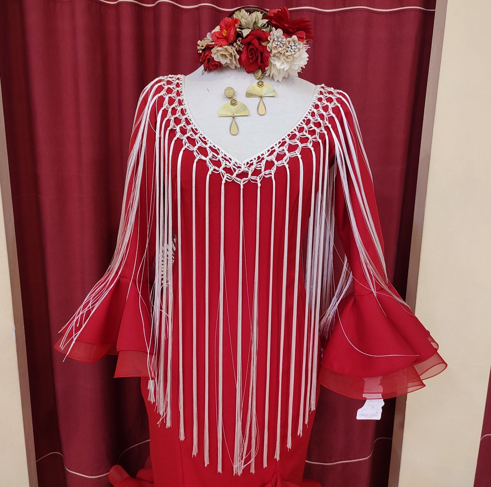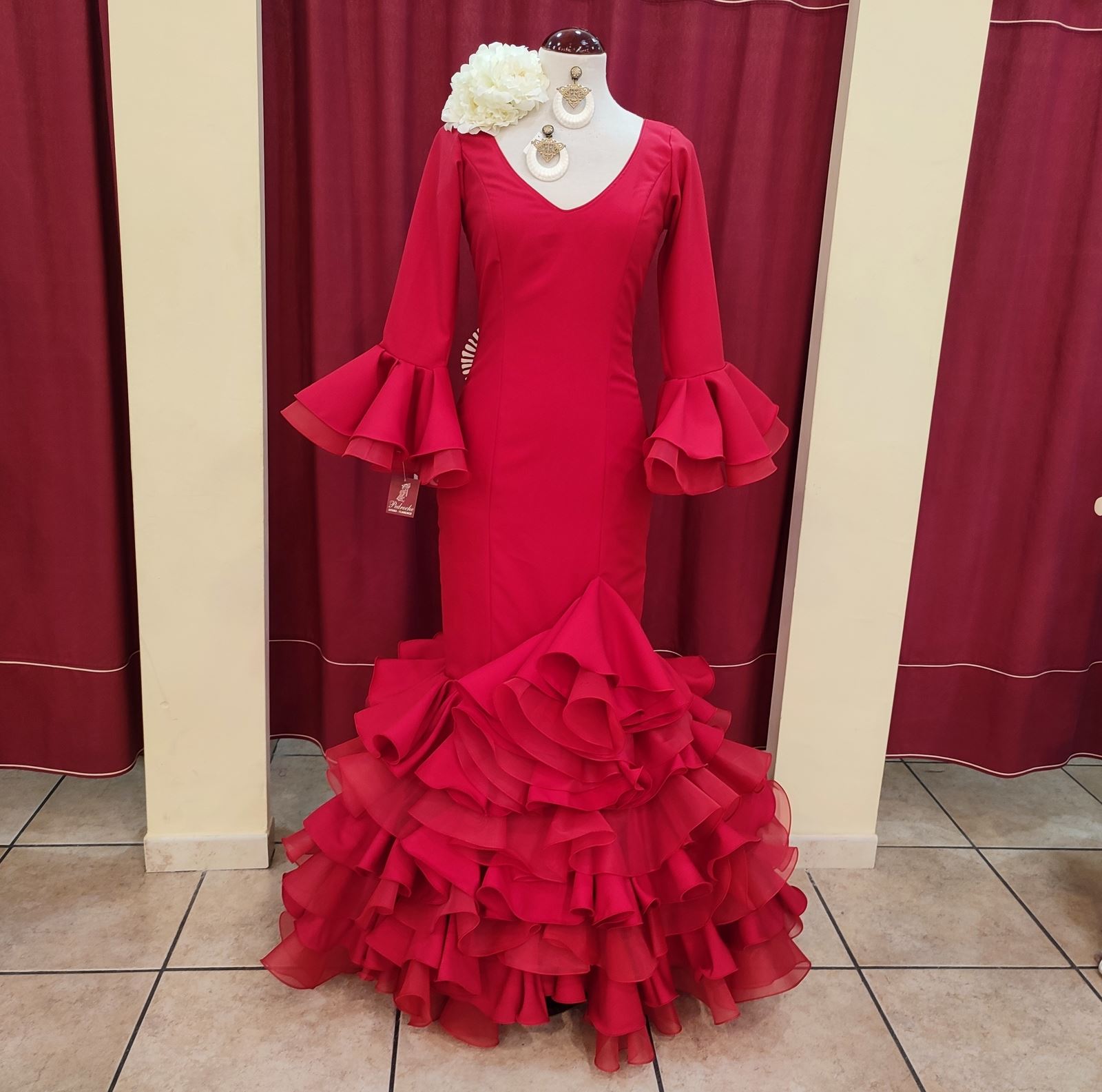 Vestido de flamenca confeccionado en tela de strech rojo con volantes combinados en organdil.