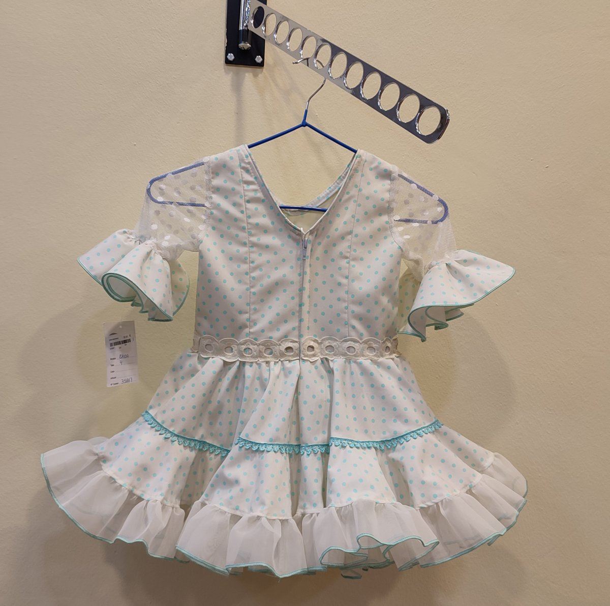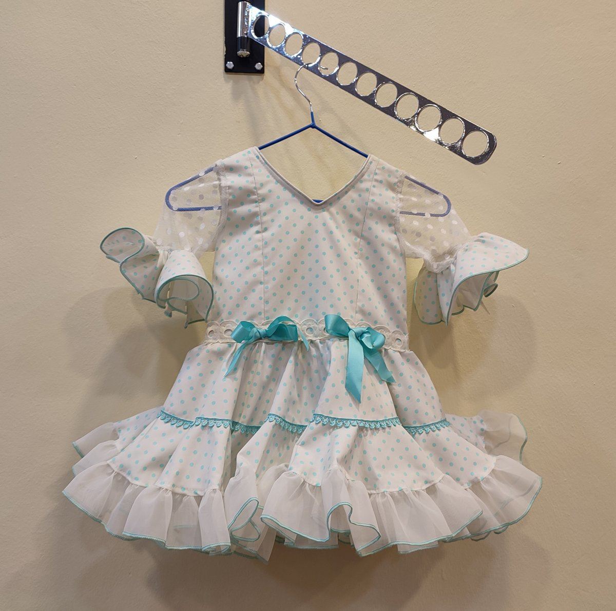 Vestido corto confeccionado en beige con lunar aguamarina.